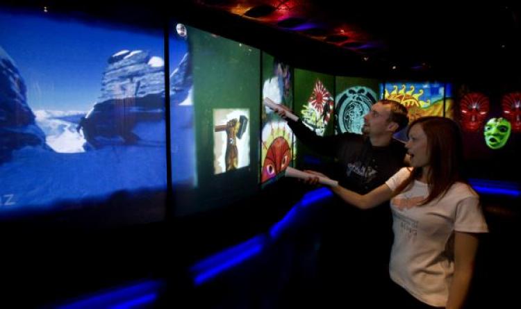 Developed in partnership with long-time collaborators Gibson Group, this cutting-edge exhibit introduces unique new interactive concepts to the public. The simple presence of visitors walking over the backlit map of New Zealand triggers multi-media displays illustrating the places they “visit”. Their transit past the large display screens at the end of the map cues a response from the electronic postcards on the display. The Wall gives them access to an ever-expanding democratic database of image, video and media, with which they can interact, edit, and montage via a “wand” device onto the 18m long multi-screen video wall. The custom-developed software which powers these exhibits was written by Gibson’s in-house team of developers.